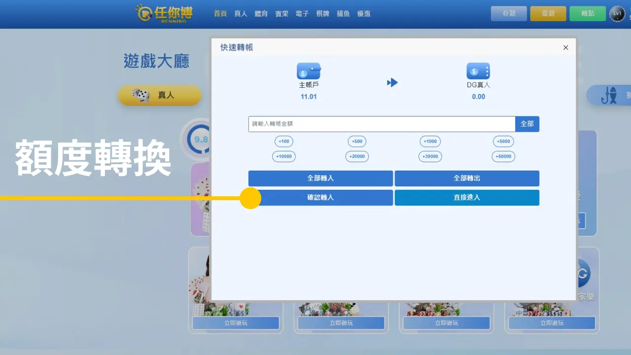 將會員帳戶遊戲幣轉入想玩的遊戲品牌帳戶。